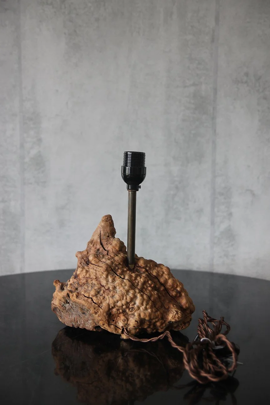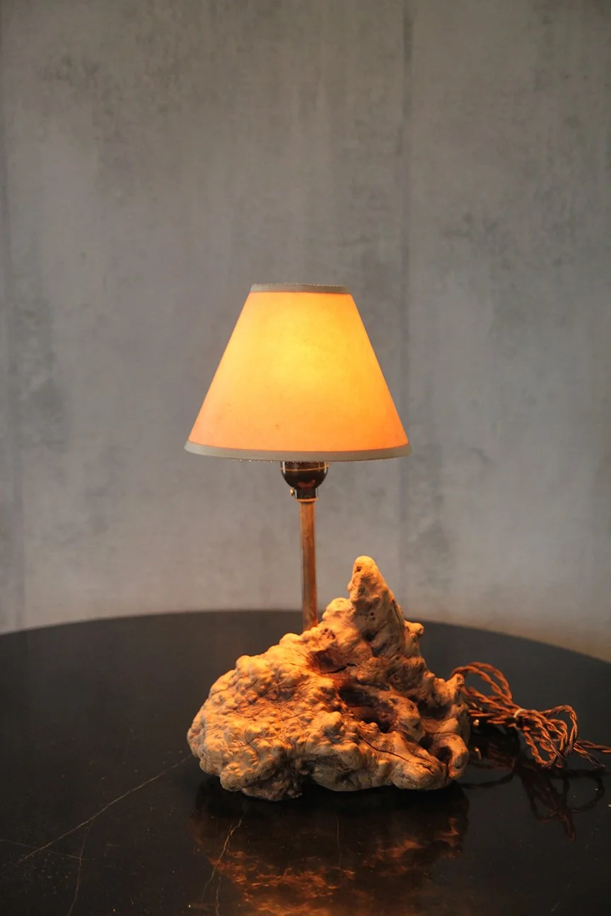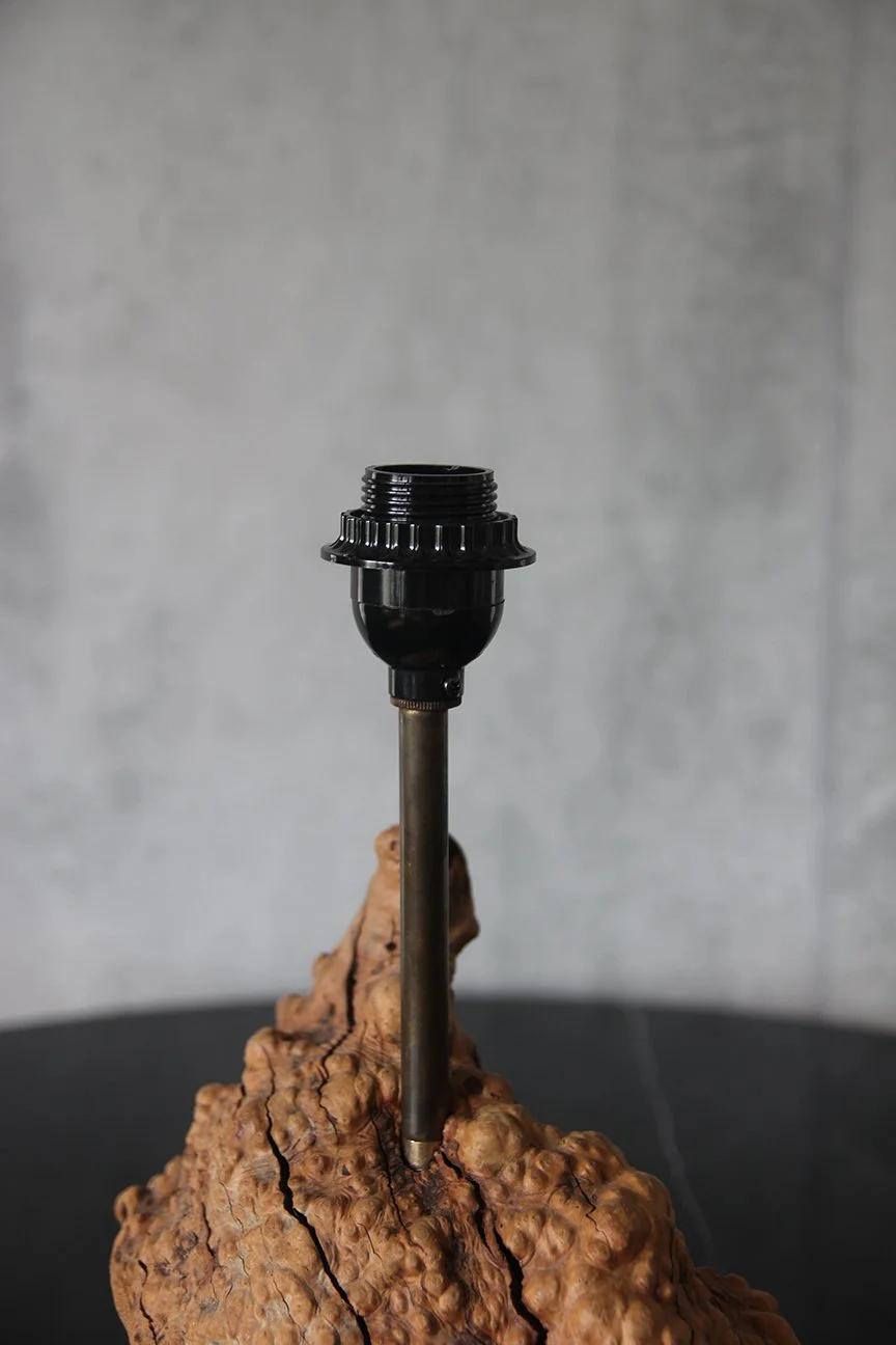 Introducing a stunning organic table lamp with a beautifully sculpted burl wood base and an elegant brass rod. Topped with a refined parchment lampshade, it provides a warm and inviting glow, perfect for any mid-century desk.
